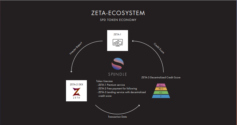 - On ZETA-3, users can lend or borrow SPD at a designated rate. Each user can refer to dispersed credit scoring calculated by ZETA-3, so malicious users will be naturally cast out, while users with high credit scores can participate in active, more challenging investments. At this stage, traders with many followers can obtain a large amount of SPD, which in turn will be lent to other users. The borrower will have an opportunity to invest with the seed SPD, and benevolent cycles will be created. Thus, SPD will serve as a lubricant in the ecosystem of ZETA.